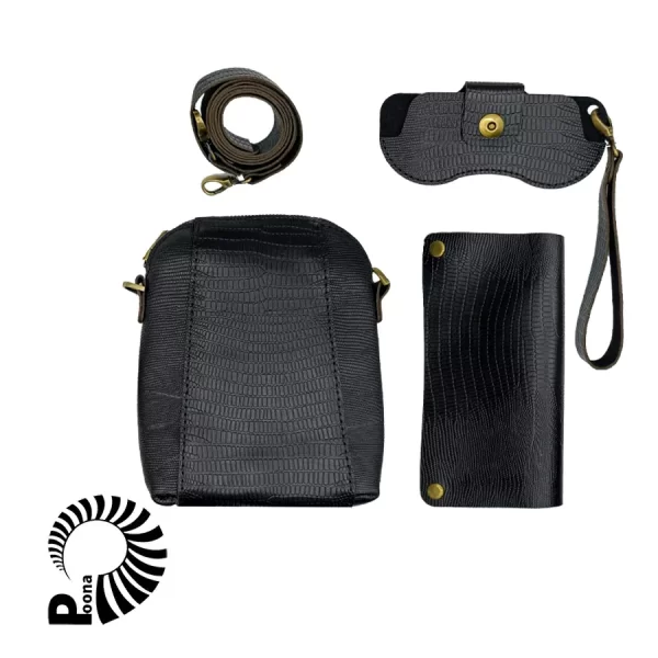 این پک شامل کیف دوشی زنانه، کیف پول و کیف عینک است که همگی از چرم طبیعی دستدوز ساخته شدهاند.